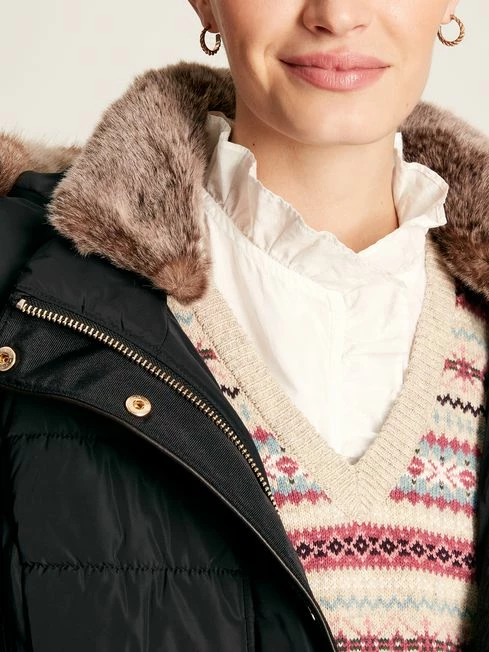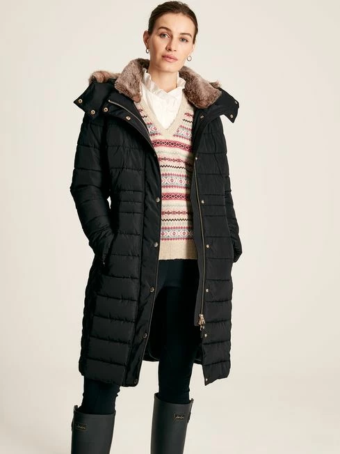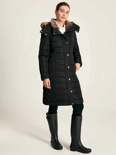 If you want to be as snug as you are stylish, our Charlington coat ticks every box. It has storm cuffs and a detachable hood with a removable faux fur trim so you can choose your level of cosiness, and is padded for a huggable layer of warmth. Unlike other padded coats that add bulk, this one has been designed with slimmer baffles to the waist and curved diamond quilted side panels to fit and flatter the body. As an extra detail, we’ve added faux leather piping details throughout and the coat lining is a bespoke jacquard print. Two-way zip and popper fastening Showerproof fabric – ideal for light bursts of rain Detachable hood with faux fur trim Faux leather piped trims Back tabs with poppers Bespoke jacquard lining Diamond side quilting and variegated baffles for a flattering fit Storm cuffs Length: 101.5cm (based on a UK size 12)