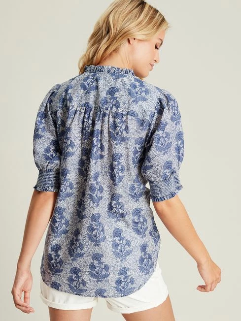 Make room for this beautiful blouse in your wardrobe. The short sleeves and hand-drawn print will pair perfectly with the sunshine, while the frilled neckline adds a delicate touch. It has pleated detailing to the front, elasticated cuffs, a button placket and flattering curved neckline. Pair with anything from skirts, shorts, jeans and more.