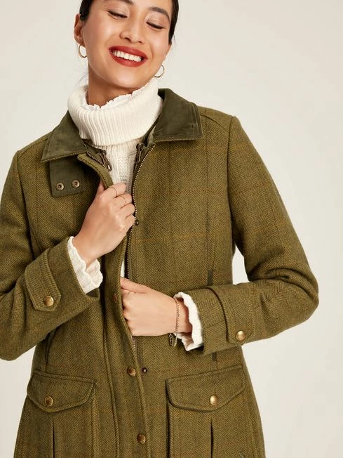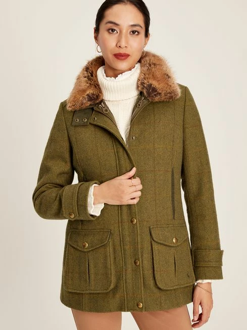 This is a sophisticated yet functional take on a traditional tweed fieldcoat. The details have been inspired by outdoor pursuits and the colours of the hardwearing tweed echo the rich landscape of the British countryside. Faux suede and antique-style brass trims add a little extra heritage, whilst the detachable luxury faux fur collar is a good-looking and practical feature. Lastly, the lightly quilted inner gilet easily detaches from the main jacket and when worn alone will make a perfect lighter layer. An investment piece that captures life in the countryside. Tweed Zip and popper fastening Removable quilted gilet Equestrian-inspired printed lining Antique-style brass trims Detachable faux fur collar Suede detailing Adjustable cuffs with poppers Patch pockets and side pockets with popper fastenings Length: 77cm (based on UK size 12)