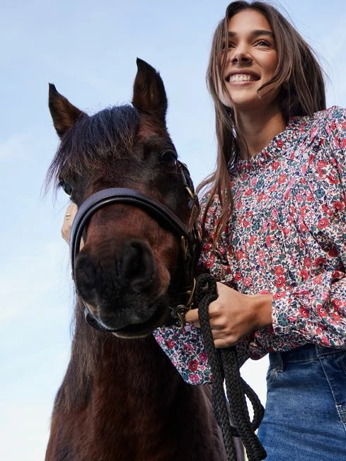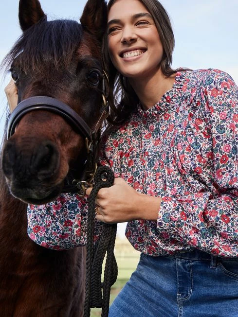 Welcome blooms into your everyday wardrobe with our Arietta voile blouse – perfect for work, weekends, occasions and more. It’s got long sleeves with button cuffs, a curved yoke with gentle gathers and a high neck with frilled trim. For both detail and practicality, we’ve added a slanted button placket to the shoulder and finished it with a flattering curved hem. Of course, it’s adorned in a hand-drawn print that makes it a real talking point.