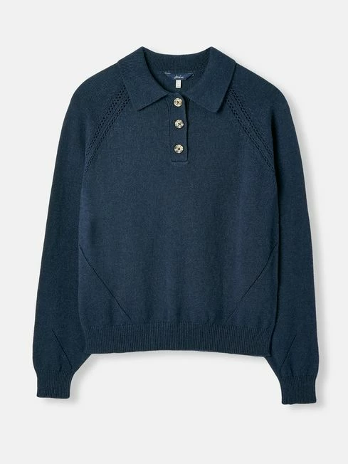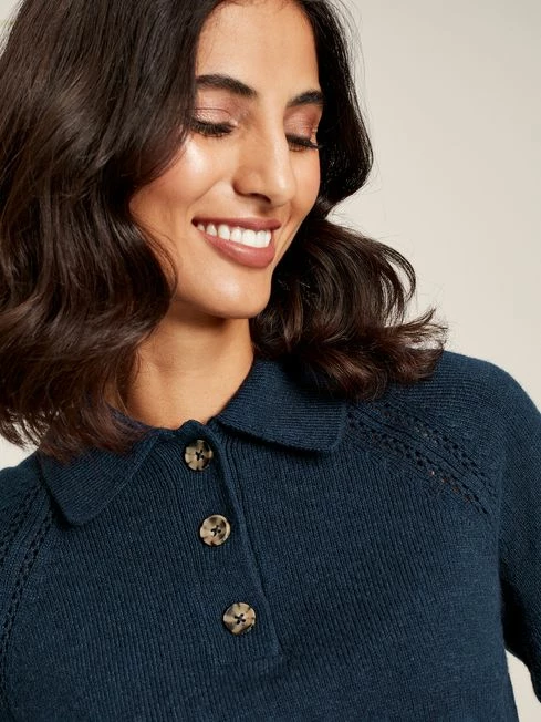 Layer up with this wonderfully relaxed jumper, designed for adding a touch of cosy style to your outfit when the British weather comes blowing in. It has raglan blouson sleeves for a slouchy silhouette, with a preppy collar and button front, along with pretty pointelle details that make this jumper extra special. Relaxed fit Raglan, blouson sleeves Collar Faux horn button fastenings Pointelle details Ribbed hem and cuffs
