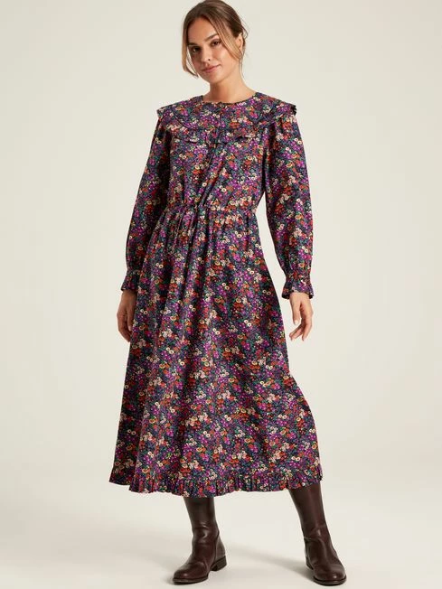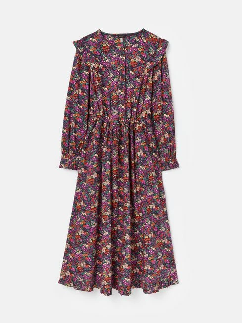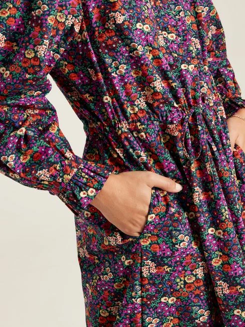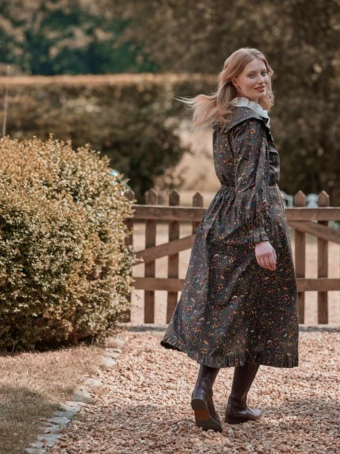 Has Heidi caught your eye? We’re not surprised. This darling twist on the traditional is going to be turning heads everywhere you go. The button placket, statement frilled yoke, hem and gathered cuffs are reminiscent of classic country style. A midaxi length and gathered waistline with adjustable fabric ties creates a flowing yet flattering silhouette that pairs beautifully with a pair of leather boots. As for the print, it’s been hand-drawn (of course!) and uses a colour palette perfect for the season. From a countryside jaunt to a party under the stars, this dress will quickly become your favourite frock. Cotton Midaxi length Frilled yoke with piping Frilled hem Button placket with fabric covered buttons Long raglan sleeves with frilled cuffs Keyhole button fastening to the cuffs Gathered waist with adjustable ties Hand-drawn print Length: 130cm (based on a UK size 12)