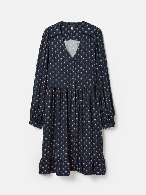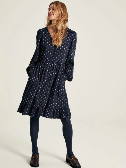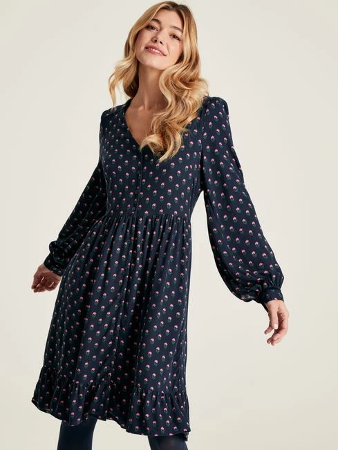 The Bonnie dress is proof that florals aren’t just for spring. Featuring high-coverage blooms in a rich colour palette, it will elevate your autumn and winter wardrobe. It’s crafted from a lightweight viscose that sits on the knee so can be styled with tights and leather boots. The V-neck and long sleeves with button cuffs open up the possibility for layering, while the peplum hem and button down fastening deliver on the details. It’s finished with plush velvet tape to the shoulders and cuffs and has rather handy side pockets. Viscose Relaxed fit On-the-knee length Long sleeves with button cuffs V-neck Button down fastening Velvet tape to the cuffs and shoulders Peplum hem Hand-drawn print Length: 100cm (based on UK size 12)