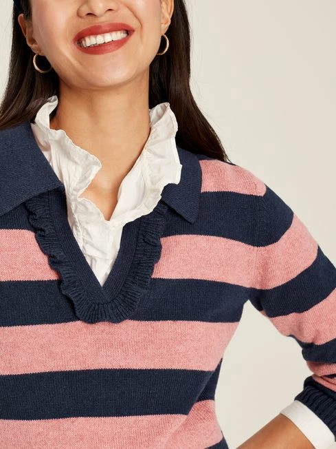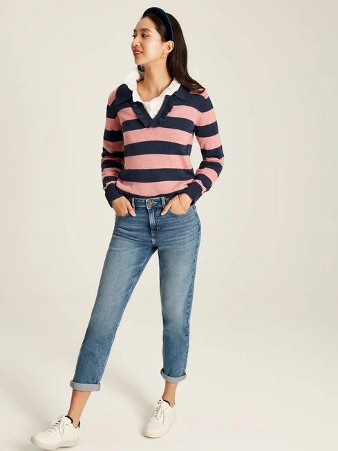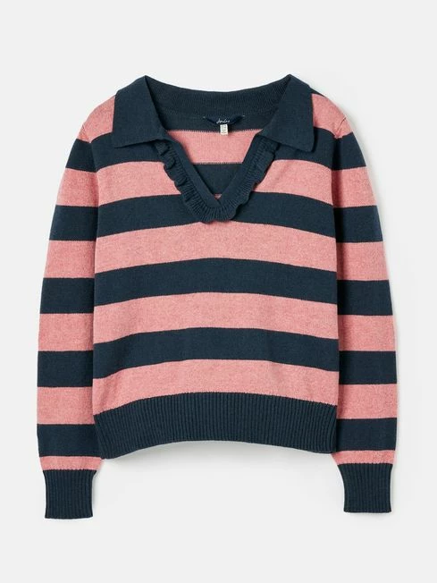The Maddie jumper is the pretty knit you need. It’s crafted from a soft cotton blend, has long sleeves with gentle gathering and a ribbed hem and cuffs. The collar with frilled trim makes it a true stand-out piece that will garner compliment after compliment. The horizontal stripes will add a timeless, preppy touch to your wardrobe and the Joules hare knitted into the back is a lovely branded touch. Cotton blend Long sleeves with gathered shoulders V-neck Collar with frilled trim Ribbed hem and cuffs Striped Joules intarsia hare to the back
