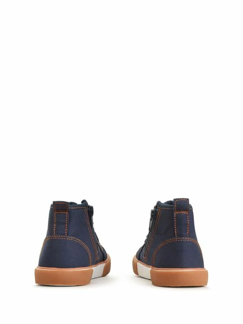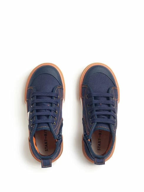 F = Standard Fit. Start-Rite’s contemporary hi-top for the cool kids in the playground. A grownup lace-up design with a handy side zip, these canvas kicks can be slipped on and off fast. Great for both indoors and outdoors, there is added toe protection and an engineered tread for grip on most surfaces. They are also washable at 30 degrees so keeping them clean and fresh is easy. In breathable navy canvas with white and orange accents. Don’t forget to add a Start-Rite measuring gauge to your basket – fit at home the Rite way using the video to help you.