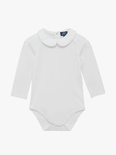 Made from soft jersey this Milo body has a Peter Pan collar trimmed with smart white piping detail. Team this staple with our dungarees and bib shorts to complete the look. It fastens with poppers at the centre back and along the leg seams for easy dressing.