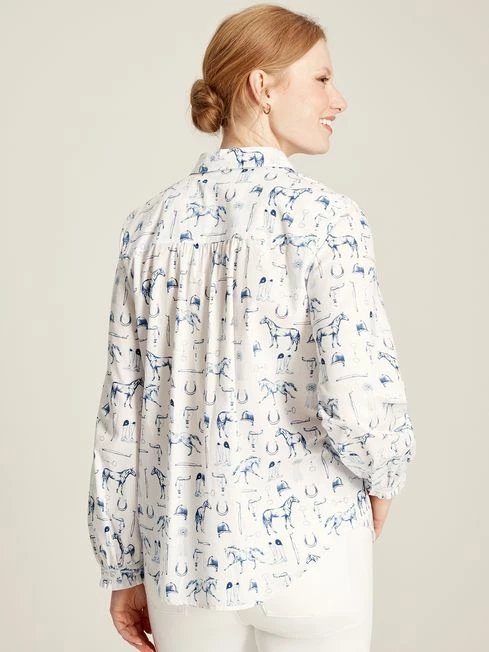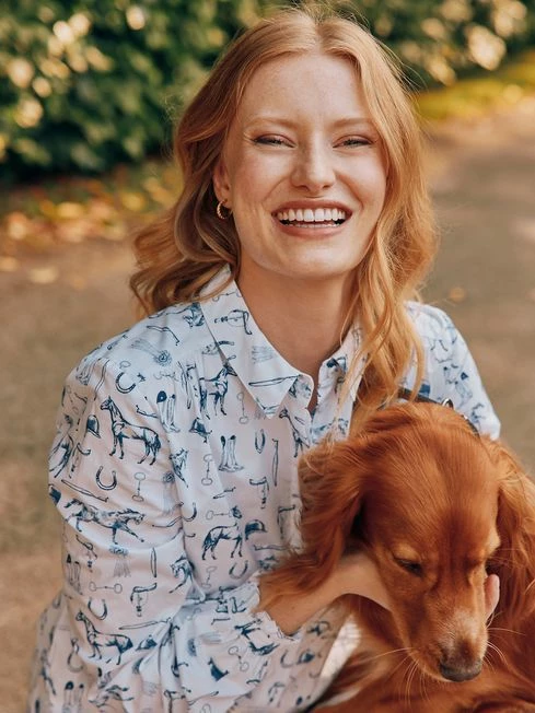 When designing the Kalina shirt we took inspiration from our roots and the result is a style that captures the true charm of a countryside life. The print has been intricately hand-drawn and features a rich heritage colour palette which will elevate your wardrobe. It has long sleeves with button cuffs which have been trimmed with an elegant frill. The curved hem adds a flattering touch, while the concealed button placket creates a clean finish. Layer it under a tweed blazer or jacket for a look that is distinctly British. Cotton poplin Long sleeves with frilled cuff detailing Button cuffs Concealed button placket for a clean finish Collar Curved hem Gentle gathering to the cuffs, shoulders and back yoke Hand-drawn heritage print